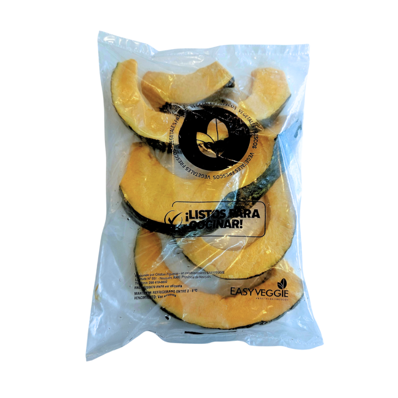 Zapallo cabuto, cortado en lonjas con cáscara, de textura firme y sabor semi dulce, ideal para guarniciones, tartas, purés o platos al horno.